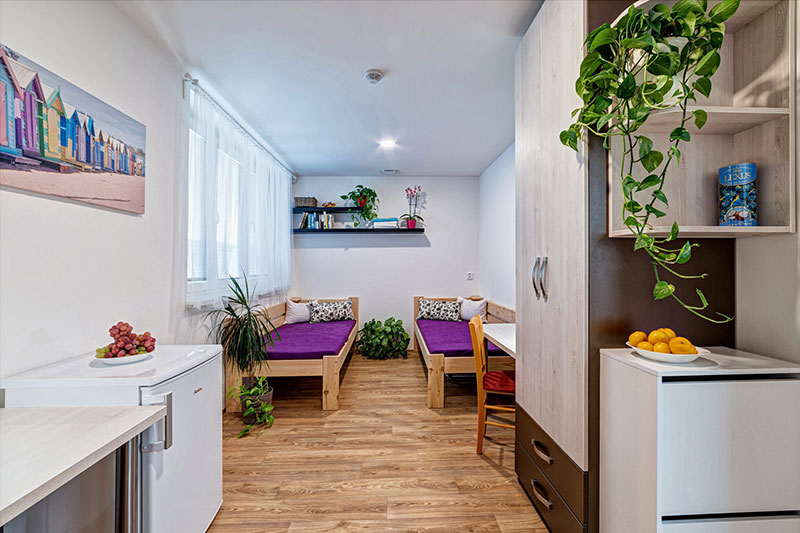 Největší pokoj v tomto domě s velkým oknem orientovaným na západ do předzahrádky. V tomto pokoji najdou pohodlné bydlení dva nájemníci. Postele jsou samostatné, umístěné proti sobě u protilehlých zdí. Dvojice skříní a stolů je doplněná samostatnou ledničkou. Kuchyně a koupelna je společná s pokojem Glasgow, tedy celkem maximálně pro 3 bydlící.